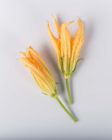 Fresh squash blossoms are available from May through October. With their mild taste, these are soft and slightly flowery with a bright orange bloom. Squash blossoms have a special place in our hearts, because this product led us to grow produce for chefs. Now we ship these blooms, fresh, worldwide.